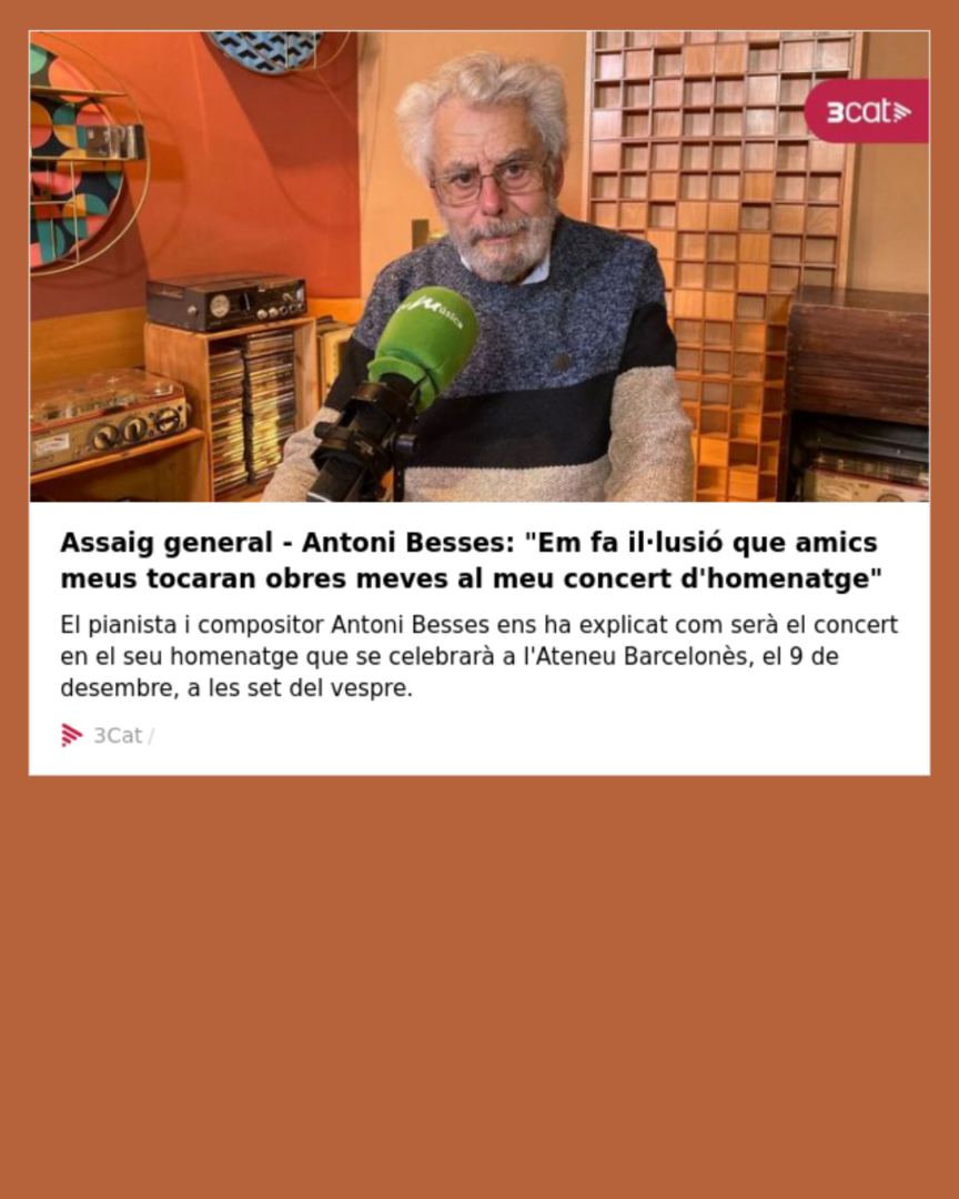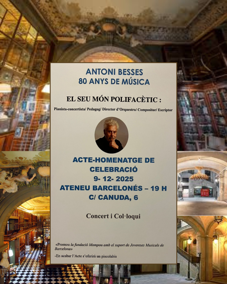 L’Ateneu Barcelonès acollirà un concert d’homenatge a l’insigne pianista i compositor Antoni Besses. L’esdeveniment, que reunirà destacades personalitats del panorama musical, està programat per al dimarts 9 de desembre a les 19:00 h. Per a l’ocasió interpretaré una de les seues composicions més recents, una obra que vaig tindre el privilegi d’estrenar el 2024.