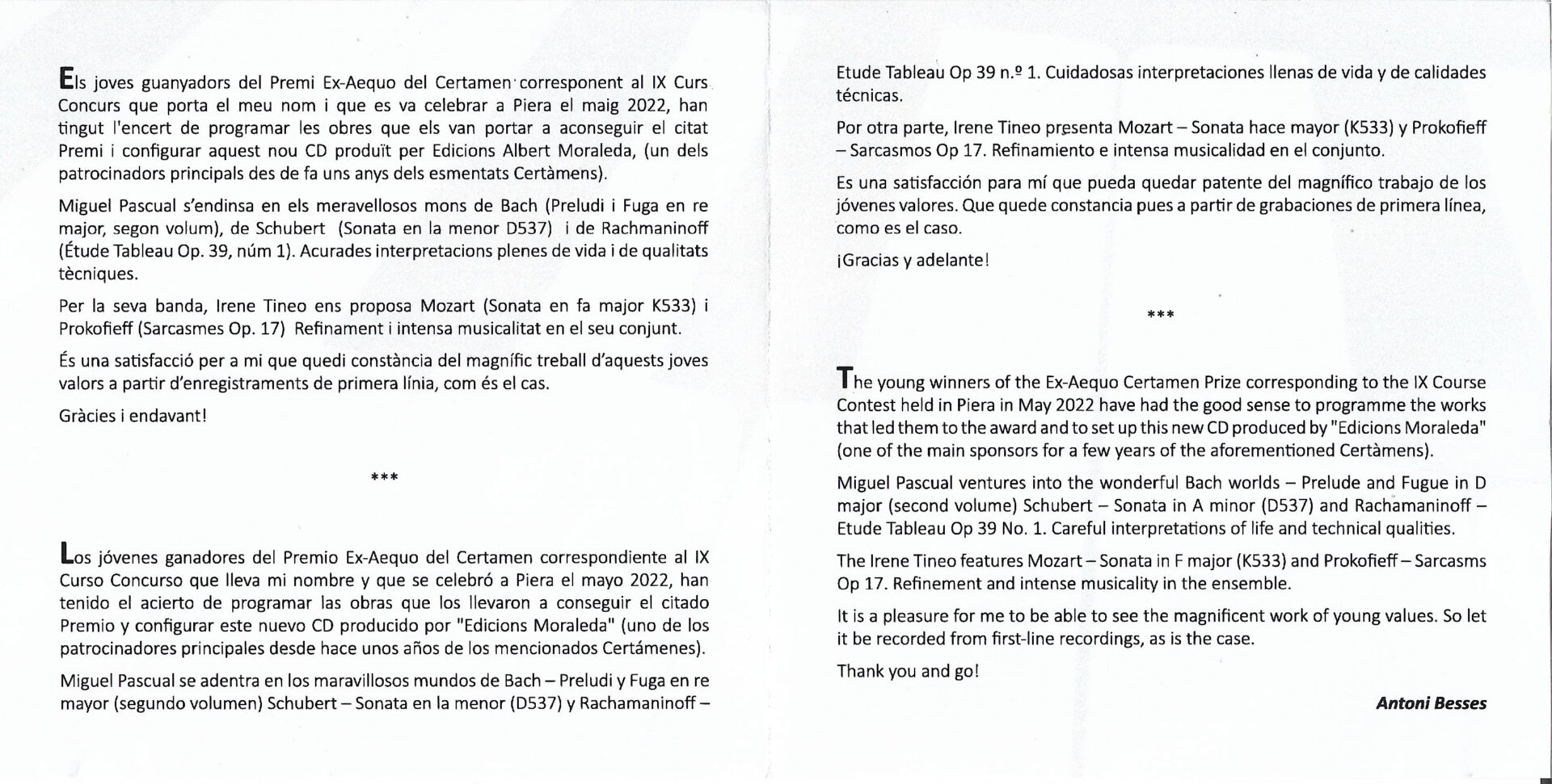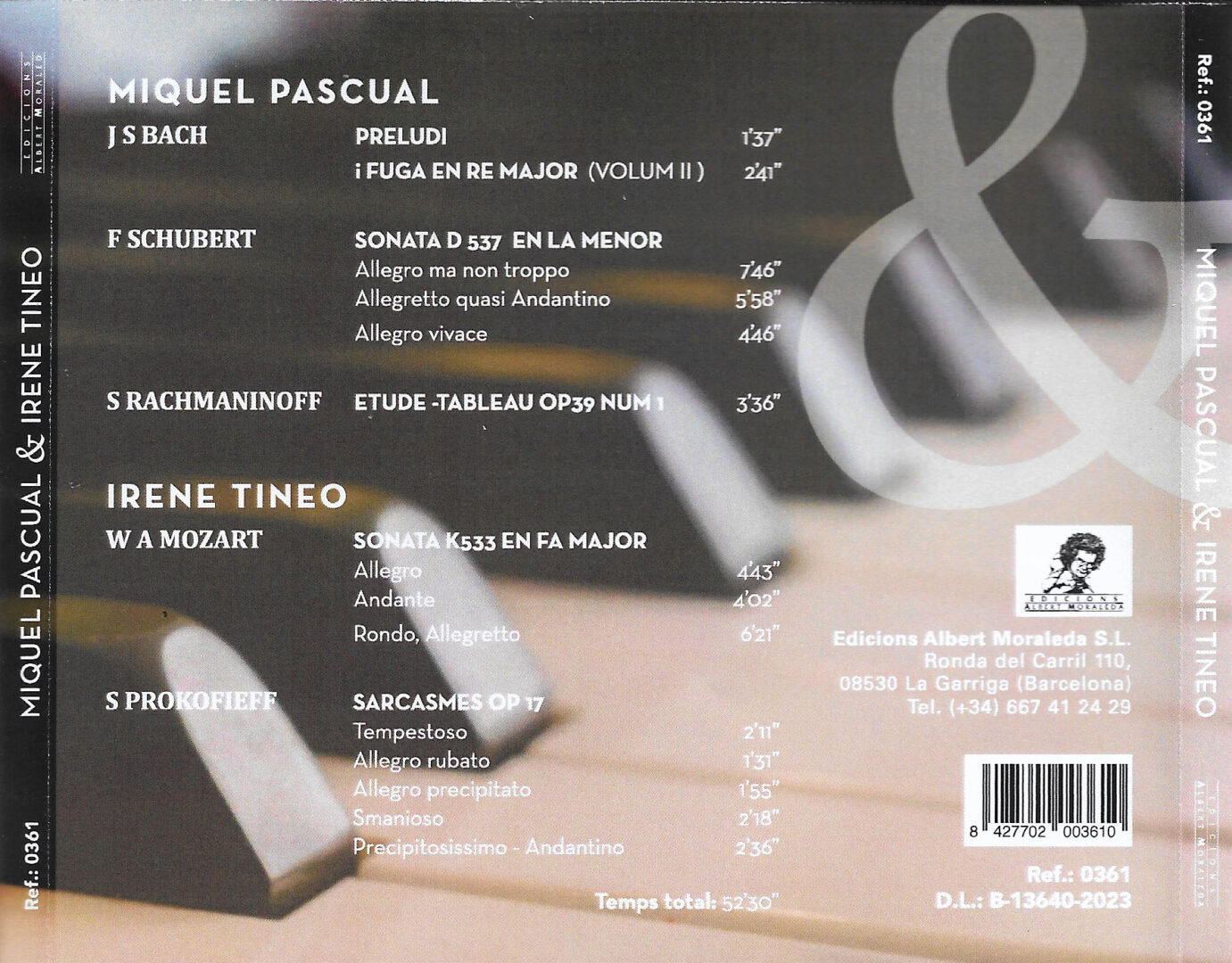 1ª edició del CD de Miguel Pascual e Irene Tineo produït per Edicions Albert Moraleda amb obres de Bach, Schubert i Rachmaninoff