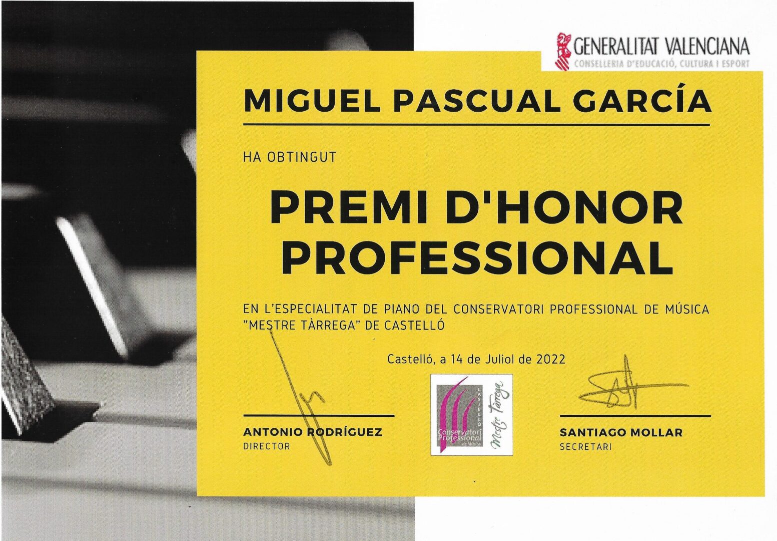 Atorgat pel Conservatori Professional de Música “Mestre Tàrrega” de Castelló als alumnes que, havent finalitzat els estudis d’ensenyances professionals de música amb expedient acadèmic excel.lent, superen les proves selectives d’aquest premi, el qual els permetrà presentar-se a la fase Autonómica.